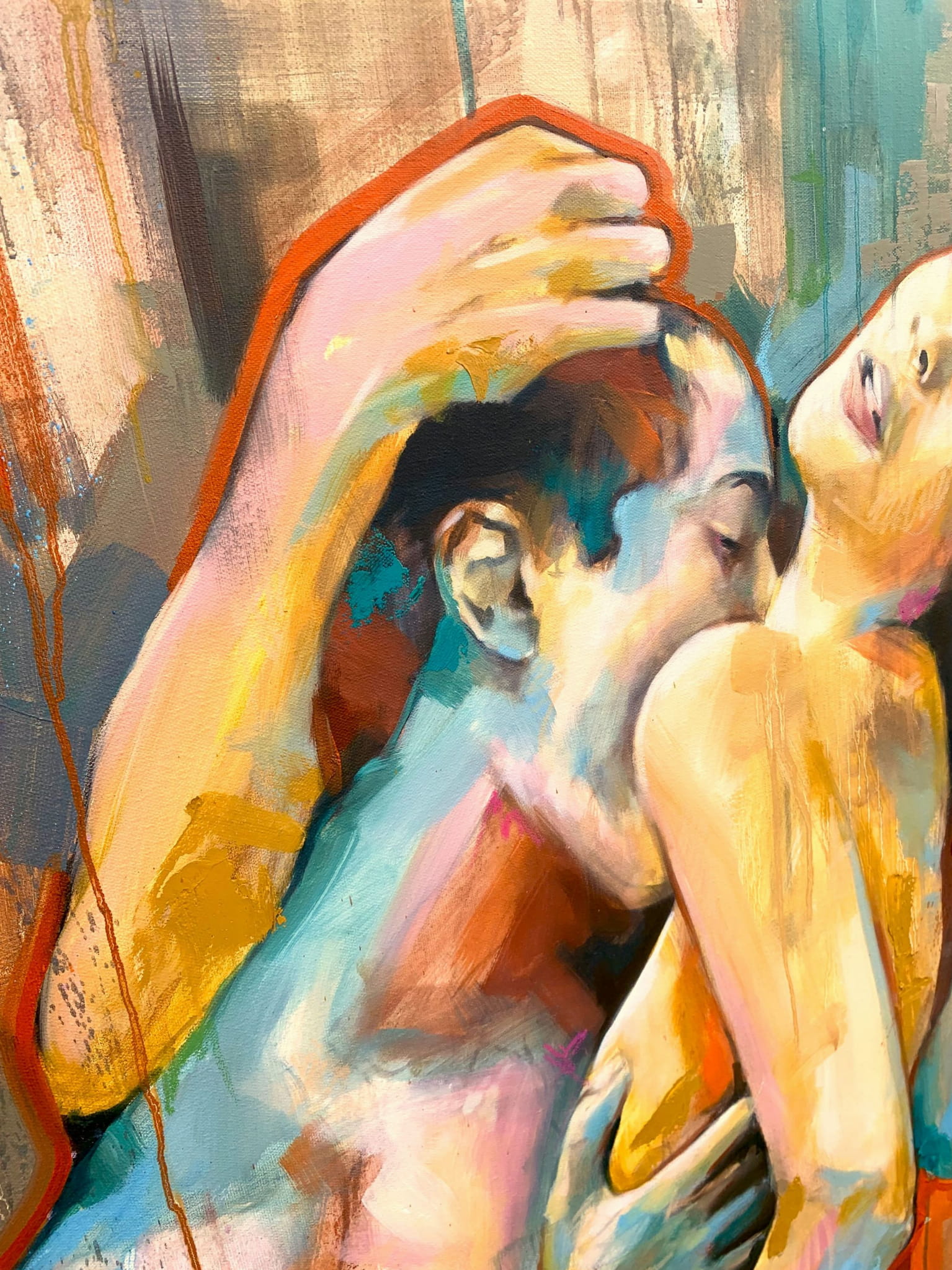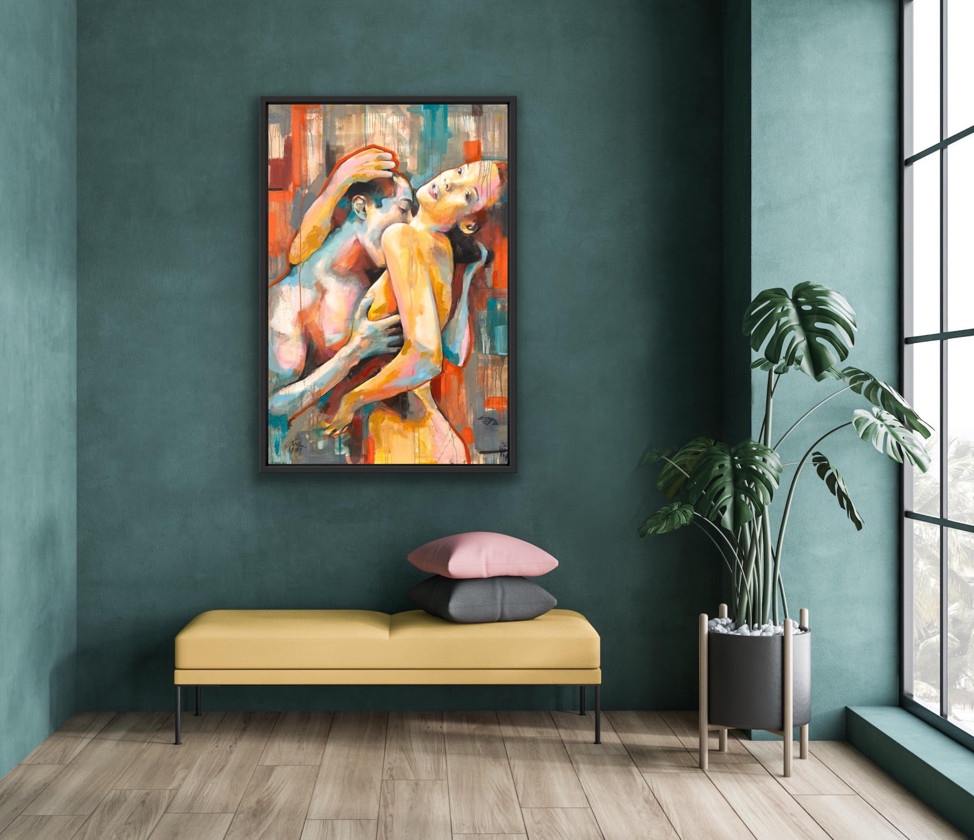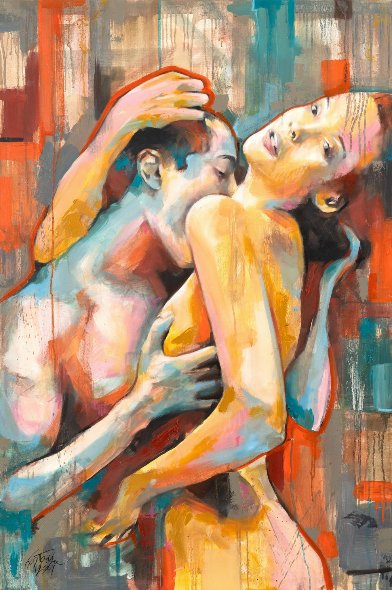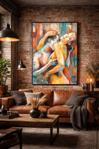 Barwny i i sensualny element dyptyku przedstawiający parę w miłosnych objęciach. Z obrazu bije gorąco hiszpańskiego wybrzeża i temperamentu. Zabierz się na ułamek chwili w podróż i oddaj impulsowi, poczuj przypływ energii i świeżości w swoim ciele. Obraz powstał by cieszyć bogactwem kolorów i ożywiać wnętrze..